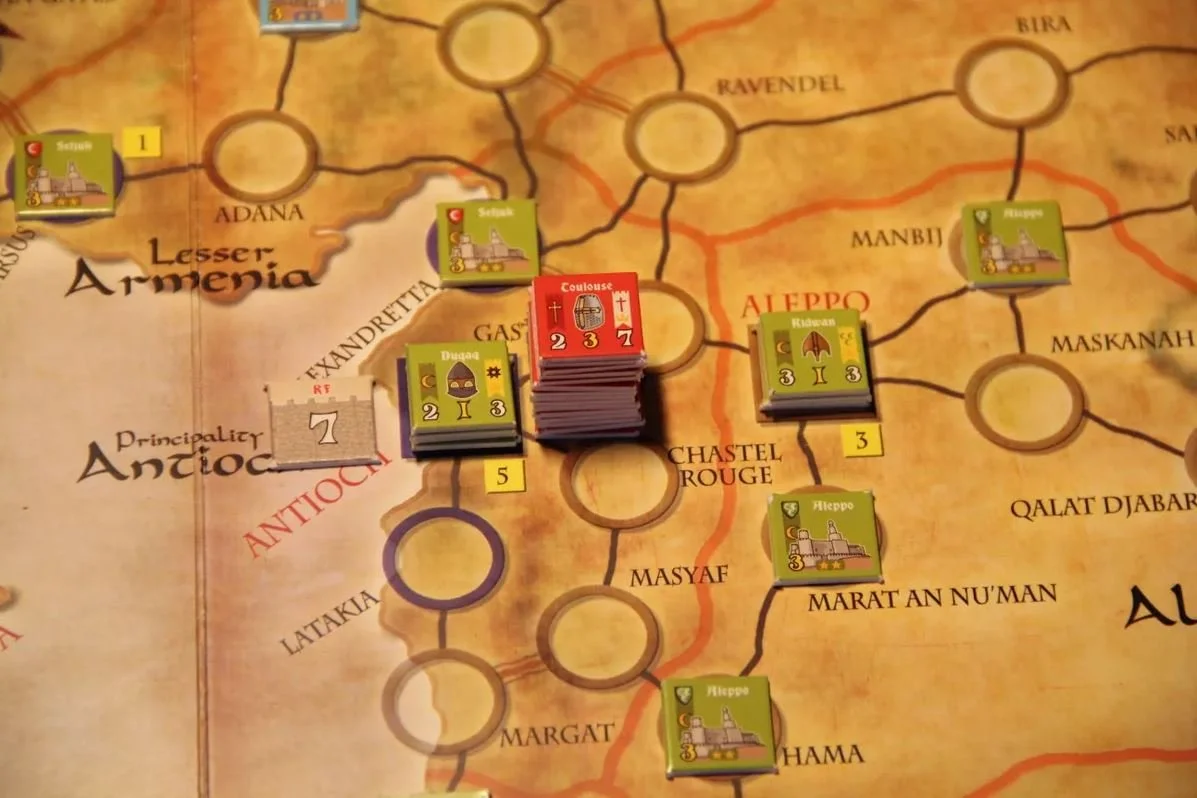The network of starting forces, alliances and castles changes from scenario to scenario, resulting in different feels to the play. But there are some common themes. The Crusading States are individually weak and typically suffer from an inability to work together. Reinforcements – in the form of a strong crusading force from Europe –- generally only arrive late and after the disastrous loss of some key military or religious real estate. The Muslim States are stronger and come with fewer, more powerful leaders, but are sometimes factional. There are unreliable allies. And there is an appropriately 12th Century feel to fate: leaders die, epidemics and storms play havoc with your plans, castles and cities might surrender meekly at the approach of a large enemy force or hold out for a year or more. And going into battle is always a risky business.