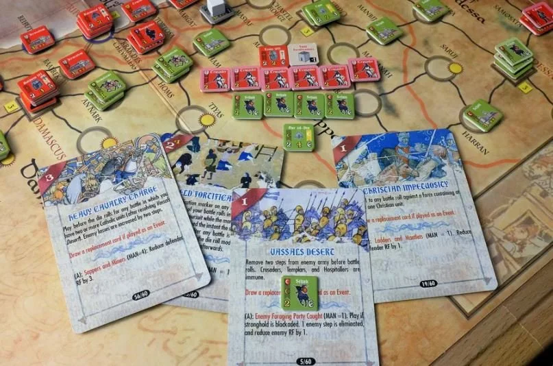 This is all achieved with a standard set of ‘We the People’ card-driven game mechanics on a point-to-point map. The map has a lovely sandy feel, covering Anatolia, the Levant and Egypt, with Byzantium and Mosul squeezed in as holding boxes, and with named leaders and faction differentiated units. Turns cover a year’s campaigning through play of a seven-card hand. Cards are played for events or to activate leaders, and also double as Siege Cards. This all works quickly and neatly, with the basic engine customised in some simple but impactful ways for period feel.