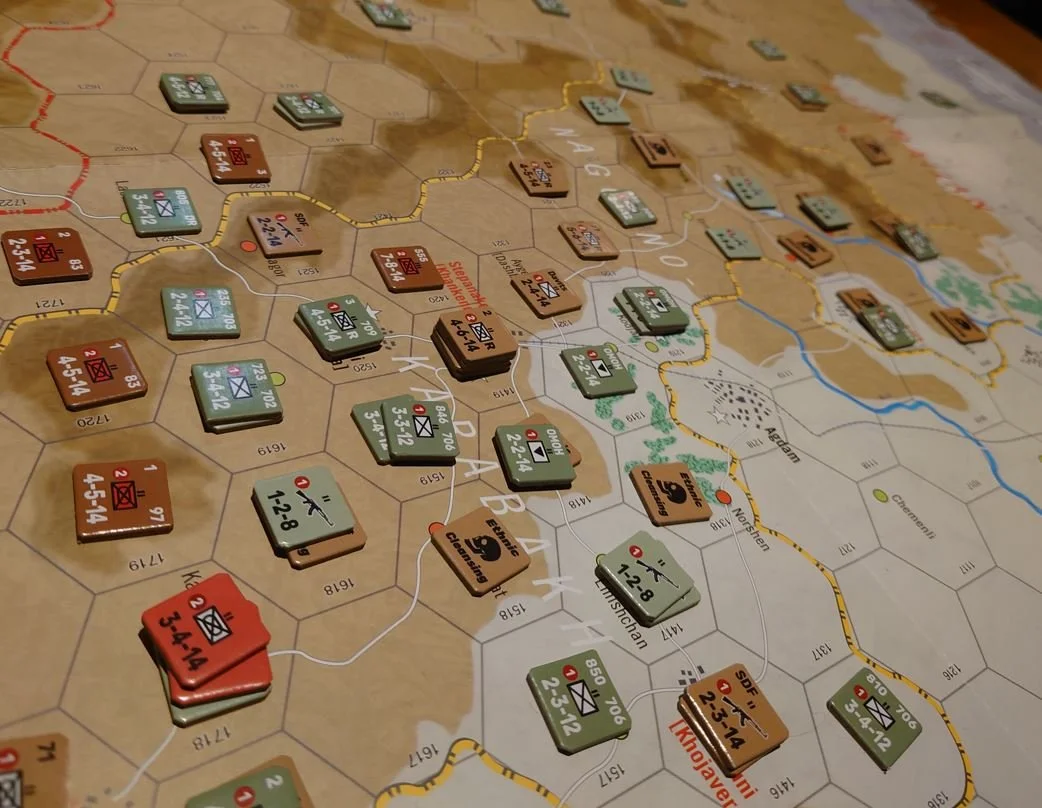 Also addressed in the game is the role of Soviet mercenaries: former Red Army units bereft of an army, who in the first three turns may join either or both sides to support attacks on the opponent. Other chrome includes a random event each turn, for example a coup in Azerbaijan drawing back units from Nagorno-Karabakh, and rolls for both the Azeri and Armenian units before combat to see the extent to which they participate. This can be particularly punishing for the Azeris, who may just flee before a fight, reflecting the chaos and politics higher up the chain of command.
